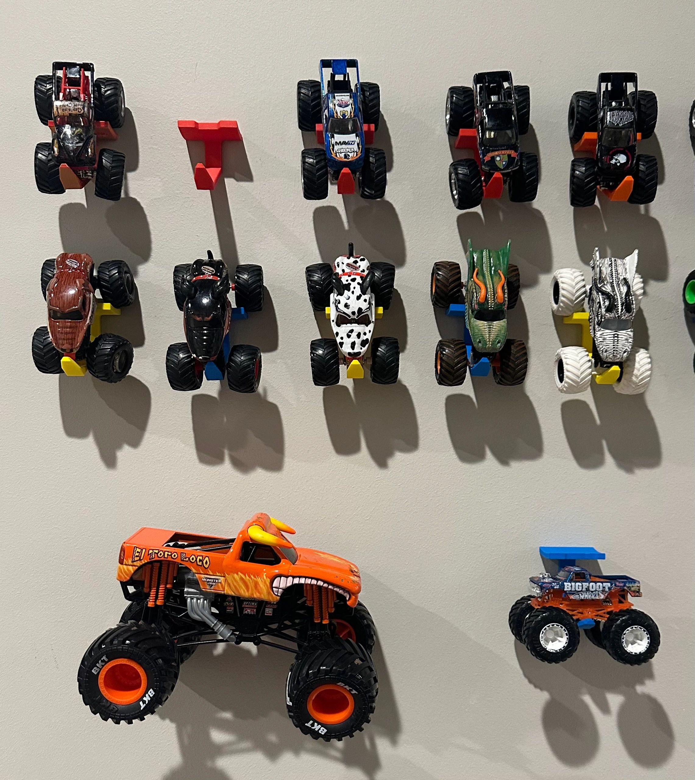 At Monster Jax, we specialize in stylish storage solutions for your monster trucks. Our simple, one-handed mounting system lets kids display their favorite designs effortlessly. Transform any wall or countertop into a vibrant showcase for their collection. Explore more at monsterjax.com!